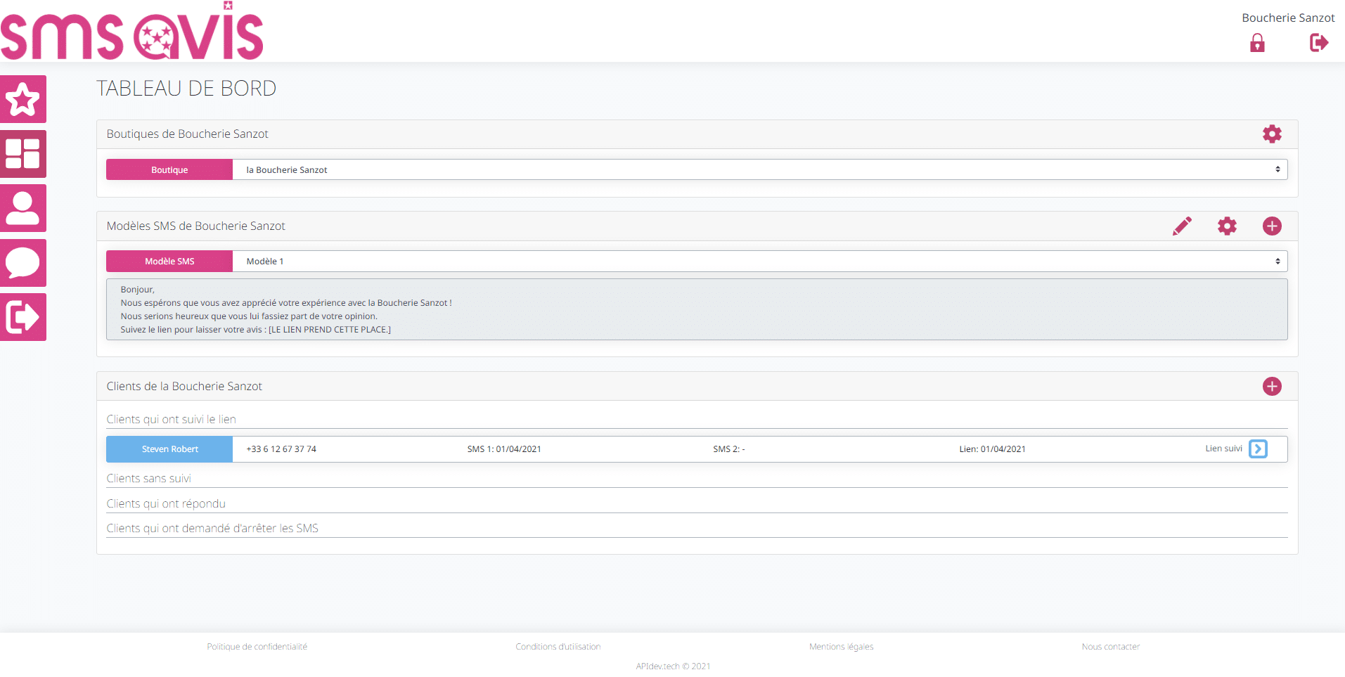 Une fois le client créé, un SMS lui est envoyé sur la base d’un des modèles que vous avez conçu pour lui demander un avis Google.
